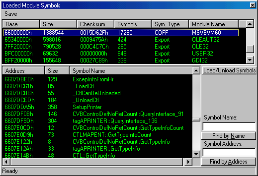 of the module, None indicates that there is no information of any kind for that module, Export indicates that it only can recover the export information, that is to say all the names of the symbols exported by the module that are accessible from the process. The other possible types of information can be COFF, PDB and some more than I don't remember. But so that these symbols are loaded they will be included inside the module or in an external file of symbols (typically a DBG) that is stored in a directory called \DBG in the same directory in which is located the debugger. The button Find By Address doesn't work correctly, it seems to be a failure in IMAGEHLP.DLL we are investigating about it. The Symbols can be loaded/unloaded in any moment pressing the button Load/Unload Symbols, once loaded there is no need to reload them again. Remember that Loading symbols could be a very slow task, so wait while the status bar indicates a Ready status. |