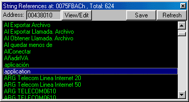 This dialog box shows a window with all the strings to which the current procedure makes references, in the title bar we can see the total number of strings and the address from the chart of pointers to these chains. We can save to a file the complete listing of the strings clicking on the button Save. We can also see the memory addressess where the string is stored, by simply clicking on the string. We can also edit the string using the Memory Editor pressing the Edit button.