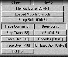 String.Refs. Ctrl+S: It shows the string references of the local procedure. See Strings Reference Viewer. Subsequently we find two columns of buttons, the left column contains the debugging buttons and the right column the breakpoints for setting breakpoints of various types. Step Trace (F8): Traces the current instruction, if the instruction is a call to another procedure inside the executable code, the purifier will enter in that call and it will stop the execution in the next instruction inside the call. Trace Ret (F12): Continues program execution until it finds a procedure return opcode. Trace Over (F10): It Traces the current instruction and stops the execution in the next instruction, if the current instruction is a call, the debugger does not enter in the call and it will execute the program until the next instruction to the call, this behavior is equivalent for the for/next instructions, allowing this way to trace the whole loop without having to execute it line to line. Trace X (F6): Traces X lines of code, a dialog box appear, you only have to enter the number of instructions to trace. API CTRL+B: Shows the dialog box management of breakpoints on API calls of the virtual machine. Opcode Ctrl+O: Shows the dialog box for management of breakpoints on opcodes. On Execution Ctrl+E: It shows the dialog box for management of breakpoints on p-code addresses.