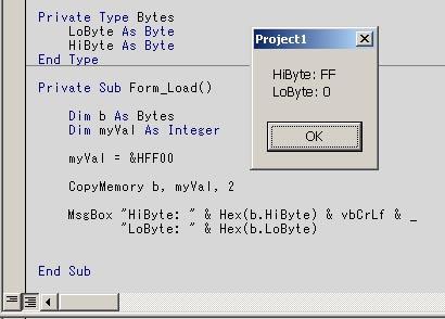 From here..you can either save them in some alternative format, easily pass the byte array to other functions, store it in a database , reconstitute it with another call to CopyMemory, or even use your knowledge of the byte layout to perform functions on it by its byte values.