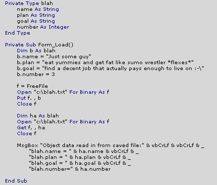 As luck would have it there is :) When I was browsing through some old C documentation I noticed a technique they were using to dump their structures straight to disk. This would allow you to save your configured object to a file with a single line of code. Curious to see if VB had implemented such a feature for its UDT handling, I whipped up the following tidbit of code.