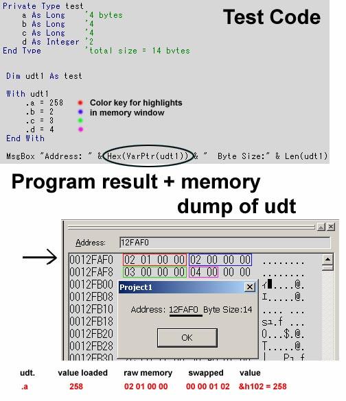 In the screen above, I have highlighted the 14 bytes that make up the UDT created by the code. I have also color coded each member of the UDT based on its variable type length. (Remember that Longs are 4 bytes long, integers 2 etc)