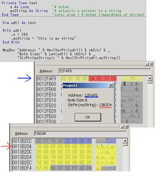 MsgBox "Address: " & hex( varptr(myUdt) ) & " ByteSize:" & len(myUdt)