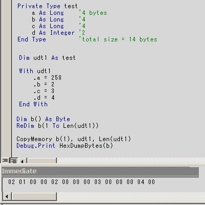 If you look at the values displayed in the immediate window, you can see that the byte array now holds the same contents as the UDT was shown to hold in memory from above.