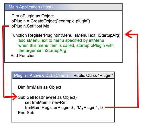 Through the object reference passed into the setHost function, the plugin now has a way to call functions on that object. The first one that it calls is the RegisterPlugin sub. In this way, each plugin can supply as many features to the host application as they want. For each one they provide, they supply a different startup argument that will passed back to them when the user selects that entries function.