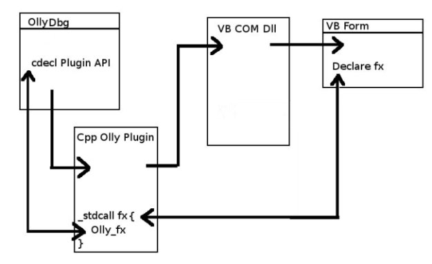Writing a VB Plugin for OllyDbgOk some people will ask why I would bother...but VB really makes interfaces a breeze, is super quick to debug, and well my entire code base is already written in it. So this article highlights a way to make a VB plugin for OllyDbg. This same technique also works for IDA plugins and PEiD plugins. The base technique can even be applied to creating Delphi plugins for IDA using standard DLLs. Olly was written in C and all of its plugin APIs use the cdecl calling convention. To be able to interface VB with it, we need to use stdcall functions and have the VB runtime properly loaded and initalized. The easiest way to accomplish both of these things at once is to create a small stub Dll plugin in Cpp for Olly to load. This stub will handle the plugin initalization, adding menu items to Olly, and then starting up our VB code when it is time to launch our plugin. The plugin stub is also responsible for providing the VB app with a set of stdcall functions so it can access the Olly cdecl plugin API. When it comes time to launch the plugin, our Cpp code creates an instance of our VB COM server and calls a method on its main interface. This loads and initilizes VB runtime and transfers execution over to our VB Code. The VB code then in turns uses stdcall exports from the Cpp dll via the VB Declare function mechanism. A basic block diagram looks like the following: