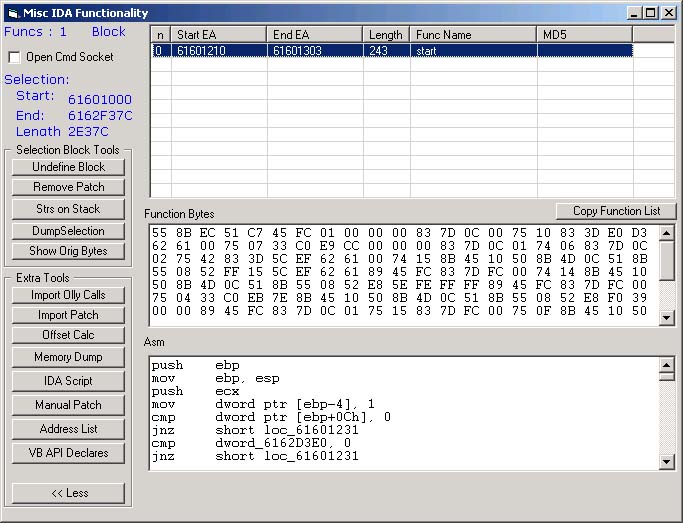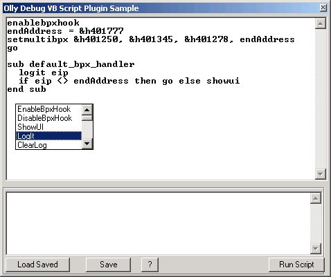 Note: This was last updated in 2006 and the IDA plugin is for v4.8! Olly plugin is still relevant. Overview: This package contains an IDA and OLLY plugin that i made in spare time to handle some of my wish list features for IDA and Olly. I will warn you these plugins are quite crude, but they serve their purpose. The Olly Plugin has 2 main features. The first is minimal script editor interface that allows you access its plugin api from vbscript. It is designed to work across multiple breakpoints. It should be working, it might be a bit buggy i havent played with it in a while. The script editor also contains a very minimal form of intellisense.