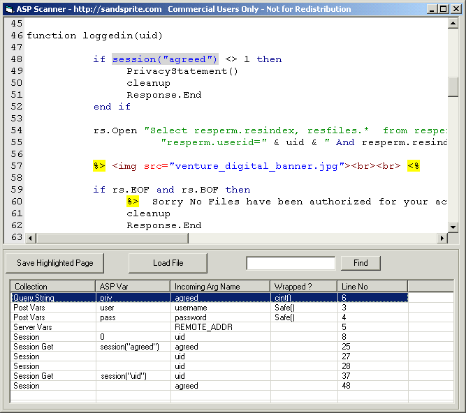 information such as line number, ASP variable name, and wether it is wrapped in another